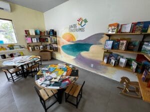Em 2024, essa história ganhou um novo capítulo. Era hora de construir uma biblioteca completa, com acervo de 500 livros catalogados e pintura especial na parede, homenageando os Lençóis Maranhenses.